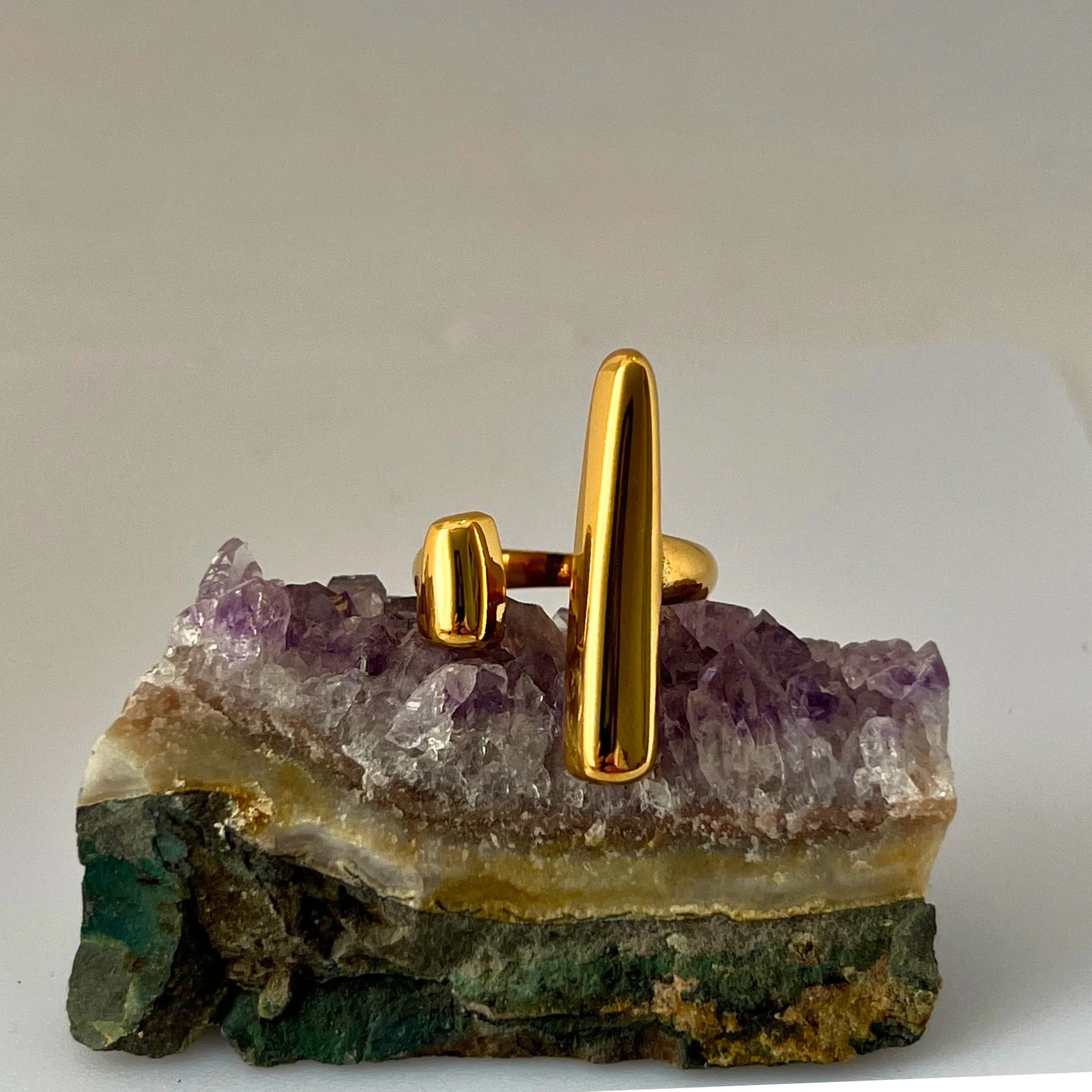 טבעת פתוחה מינימליסטית עם אלמנט בר אנכי ארוך לצד בר קצר יותר, שיושבים זה מול זה ויוצרים גאומטרית נקייה על האצבע. היא עשויה סטיינלס סטיל היפואלרגני, עמיד במים ובשחיקה, ומגיעה בבחירה בין גוון כסף מבריק לבין ציפוי 18k gold PVD זהוב וחמים ששומר על הברק לאורך זמן. המבנה הפתוח מאפשר התאמה נוחה למידת האצבע, והעיצוב המודרני שלה נראה מעולה גם כטבעת סטייטמנט בודדת וגם בשילוב עם טבעות דקות נוספות לסטאקינג
